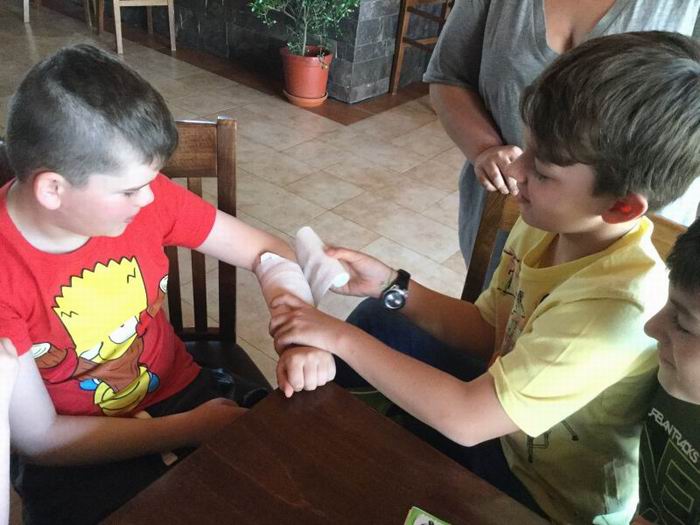 Hneď po raňajkách sme mali užitočnú prednášku našej pani zdravotníčky, Aleny Feckaničovej, ktorá bola zameraná na ošetrovanie drobných poranení, riešenie krízových situácií... Žiaci si prakticky vyskúšali obväzovú techniku a resuscitáciu. Po prednáške sa rozdelili do štyroch skupín a striedali sa na štyroch stanovištiach.