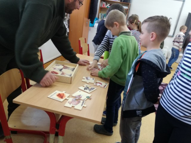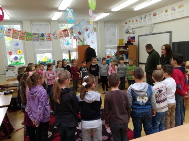 Všetci v kruhu sme sa dozvedeli, kto chce byť vlkom, veveričkou, líškou, medveďom, srnkou, či jedličkou. Žiaci si počas stretnutia s lesnou pedagogičkou zahrali aj hry: naháňačku na jašteričky, hru motýle a netopiere, lovili medveďa a skladali drevené puzzle s lesnou zverou. Za usilovnosť žiaci dostali sladkú odmenu a na pamiatku pečiatku lesného zvieraťa.