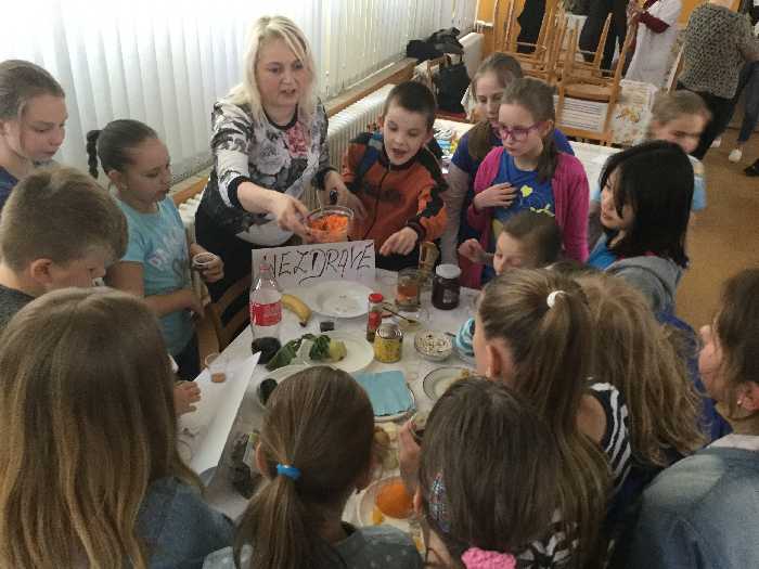 "Farebného týždňa zdravia", ktorý má už na našej škole dlhoročnú tradíciu, mohli preveriť nielen svoje vedomosti o zdravom štýle života, ale aj zabaviť sa a preukázať súdržnosť a bojovnosť pri plnení rôznych zaujímavých aktivít. Do súťaže sa zapojili žiaci 3. až 6. ročníkov, z ktorých sme vytvorili 6 zmiešaných družstiev po 7 žiakov. Tí potom jednotlivo alebo v skupinách súťažili až v ôsmich disciplínach: pohybová hra na postreh, pexeso, ochutnávka zdravých jedál, vedomostná hra, chytanie rýb v rybníku, kvíz, skladanie viet o zdraví... Žiaci napriek zmiešaným družstvám preukázali spolupatričnosť a snažili sa o získanie každého jedného bodu pre svoj tím. Najlepšie sa darilo šiestemu družstvu v zložení: