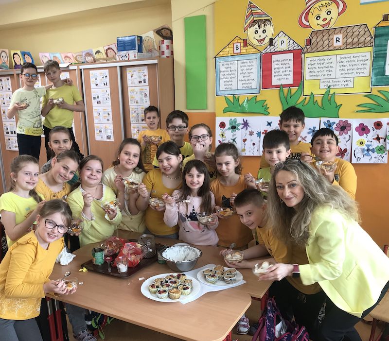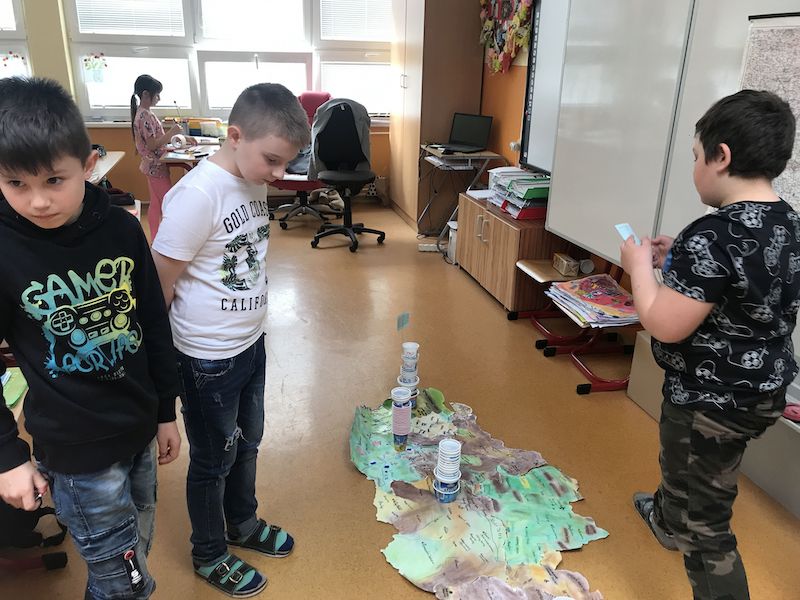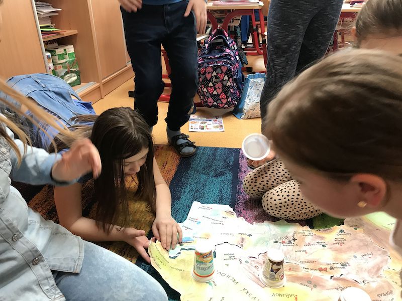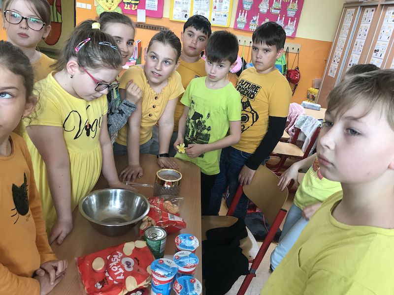 V závere týždňa sme navštívili najbližšiu predajňu potravín CBA a vyhľadávali naše slovenské mliečne výrobky a našli sme aj smotanu, ktorú sme použili v zákusku. Bola vyrobená v Nitre. Po návrate do triedy sme na mape vyhľadávali mestá, z ktorých mliečne produkty pochádzali.