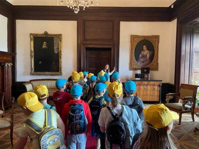 Pri návšteve humenského kaštieľa zažili zábavno-poučné sprevádzanie v umelecko-historickej expozícii dobových interiérov. Dozvedeli sa zaujímavosti o histórii humenskej dominanty a o ich panovníkoch. V interiéri kaštieľa mohli vidieť pece a kozuby zdobené kamennými rímsami a bočnými stenami. Vo vestibule na poschodí prvákov zaujal kozub zdobený rodinným erbom Andrássyovcov s heslom FIDELITATE ET FORTIDUNINE (Vernosť a čestnosť) a s plastikami levov. Na stenách mohli vidieť skvostné olejomaľby grófa a grófky Andrássyovcov. Upútalo ich aj pánske krídlo kaštieľa charakterizujúce tmavým dubovým obložením stien. Obdivovali obrovskú knižnicu, v ktorej dostatok času trávilo panstvo pri krbe čítaním kníh. No a aké prekvapenie ich čakalo v dámskom krídle miestnosti so svetlým dreveným obložením na stenách? V pozlátenej brokátovej sedačke zbadali oddychovať naozajstnú princeznú, ktorá im porozprávala o živote v minulosti, čo robievala počas dňa a ako jej pomáhali poštové holuby. Naši zvedaví prváci princeznú zahltili toľkým množstvom otázok, že si princezná musela ísť oddýchnuť do svojej obľúbenej obrovskej postele s baldachýnom. A my s nadšením po stretnutí s princeznou sme potichučky ukončili naše rozprávkové sprevádzanie v kaštieli.