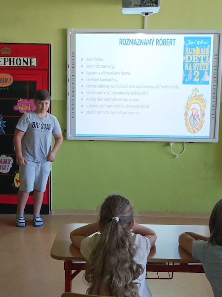 Aby ich práca bola perfektná, originálna, zážitková a výchovná museli si prečítať knihy od Davida Waliamsa – Najhoršie deti na svete – a to všetky tri časti. Po ich prečítaní si každý žiak vybral jednu postavu, ktorú opísal a charakterizoval v 1. osobe singuláru. Nebolo to jednoduché, pretože deti Davida Waliamsa sú neposlušné, hašterivé, huncútske, no jednoducho sú to najhoršie deti na svete. Všetko spoločne potom vypracovali a vložili do spoločnej prezentácie. Svoje výkony predviedli žiakom 3. a 4. ročníka. Cieľom ročníkovej práce bolo poukázať na tvorbu Davida Walliamsa, a hlavne vysvetliť deťom, čo je správne a čo nie – pretože každý príbeh danej postavy bol zaujímavý a originálny a deti pri svojej prezentácii vyvodzovali z neho ponaučenie. Okrem tohto cieľa si zároveň deti vyskúšali ,, byť v koži iného “. Popasovali sa aj s umením rétoriky, čo nie je tak jednoduché, ako to aj všetci skonštatovali, ale zvládli to na výbornú.