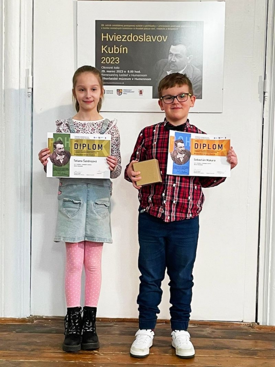Na okresnom kole nás úspešne reprezentovali Tatiana Šandrejová 2. miesto, Sebastián Makara 2. miesto, Lucia Halická 3. miesto, Slavomíra Hirková 3. miesto. Týchto recitátorov pripravovali p.uč. Čepová, Závodská, Krišková, Janíková. Srdečne blahoželáme k úspešnému umiestneniu!
