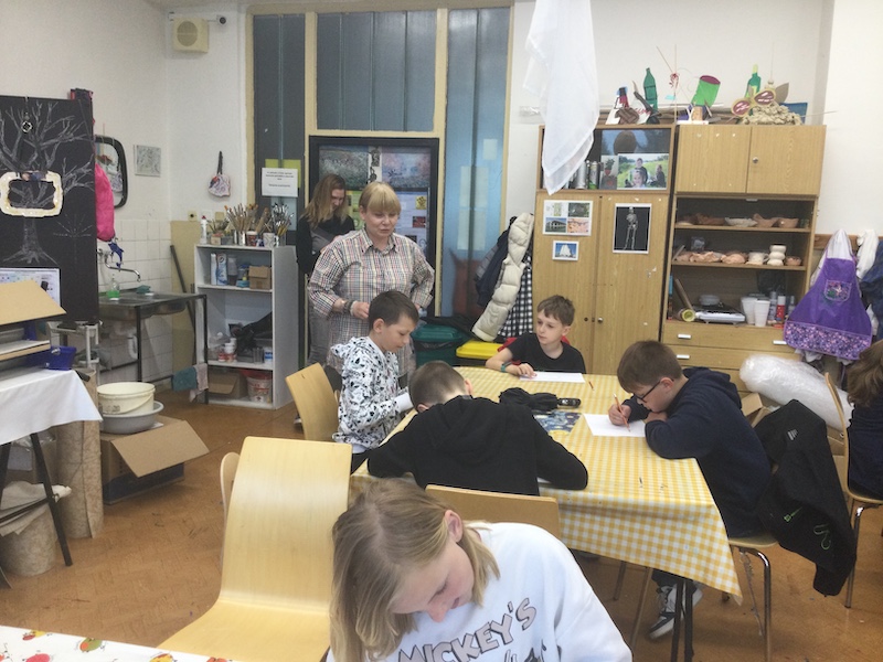 Vo výtvarnej miestnosti nás čakala pani učiteľka Jana Bercelová, ktorá pre nás pripravila zaujímavú výtvarnú dielňu. Žiaci zažili skutočnú atmosféru umeleckej školy. Bolo tu množstvo prác žiakov, výrobkov, farieb a výtvarných materiálov.