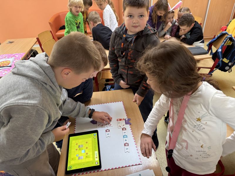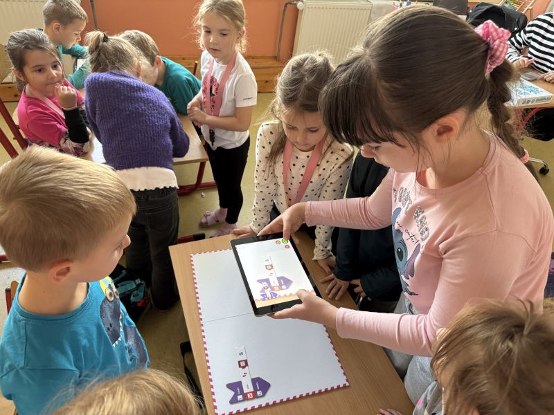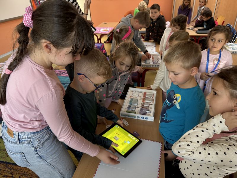 Veľkým zážitkom bola aj aktivita, kde sa naši najmenší žiaci stretli s mimozemšťanom Scottiem. Do tajov hry Scottie Go! však prváčikov nezasvätili len učitelia. Skvelú prácu odviedli naši starší mentori – Evka, Roman a Sebastián z 5.A, ktorí mladším spolužiakom trpezlivo vysvetľovali, ako fyzicky skladať programy z kartónových kódovacích blokov. Následné overenie kódu pomocou tabletov prinieslo vždy veľa radosti.