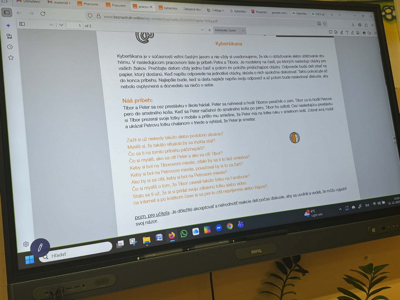 • Modul 2: Kyberšikana – príbeh Emky: Žiaci reagovali na nevhodné správanie online. Žiaci porozumeli pojmu kyberšikana a jej formám. Uvedomili si rozdiel medzi žartom a ubližovaním. Naučili sa, ako reagovať, keď sú svedkom alebo obeťou kyberšikany. Zároveň rozvíjali empatiu, bezpečné digitálne správanie a schopnosť vyhľadať pomoc.