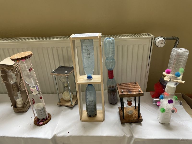 Prváci si na vyučovanie priniesli plastové fľaše, vrchnáky s dierami, náplň do presýpacích hodín (piesok, koráliky, soľ, ryžu, kryštálový cukor...), lievik a lepiacu pásku. Žiaci do fliaš pomocou lievika nasypali náplň. Dva vrchnáky z fliaš spojili lepiacou páskou a zakrútili späť na plastovú fľašu, v ktorej sa nachádzala náplň. A zhora na fľašu s náplňou a vrchnákmi prikrútili druhú fľašu – prázdnu. Týmto mali vyrobené vlastné presýpacie hodiny.