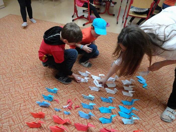 Zrealizovali sme aktivitu - spoločné vytvorenie slovenskej vlajky z papierových labutí. Pani učiteľku Čepovú k nej inšpiroval jej žiak Artur Budaj, keď jej cestou z exkurzie v Košíciach poskladal vo vlaku z papiera labuť. (video tu: http://vimeo.com/107080536 ) Pani učiteľka postup natočila a v piatok pustila žiakom, ktorí sa zúčastnili tejto aktivity: Z papiera červenej, modrej a bielej farby zhotovovali labute. Tie potom poukladali na zem do tvaru našej slovenskej vlajky. No a na záver povedali niekoľko viet v angličtine. Aktivity sa zúčastnili žiaci 2.A s pani učiteľkou Čepovou, žiaci 3.A s pani učiteľkou Alexovičovou a žiaci 3.B s pani učiteľkou Antalovou.