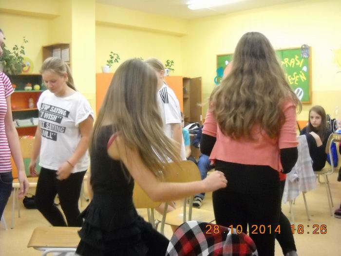 Len tu zrazu vrazilo do triedy strašidlo. Namiesto uši a oči malo akési diery, na holej hlave šiltovku a krk si to zakrývalo šálom. A bálo sa. No, počuli ste už o niečom takom, aby sa strašidlo bálo? Nuž sme sa doň pustili a pomocou indícií sme zistili, že to bola.................neprezradím. Obzrite si fotografie. Akurát jedna indícia – učí u nás prvý rok.
