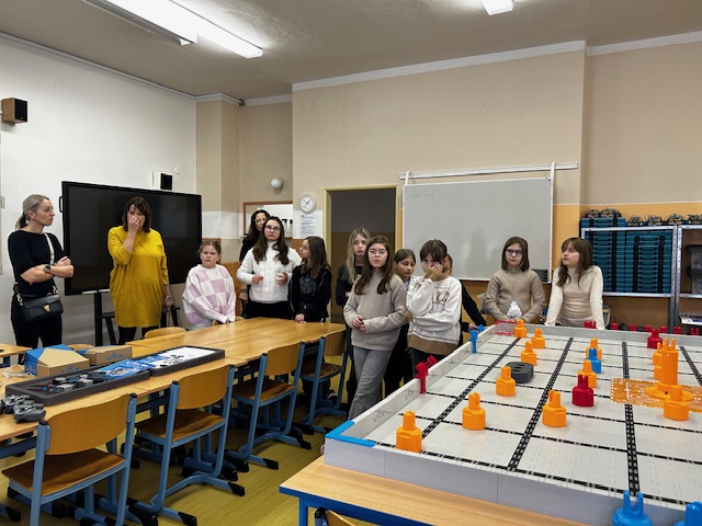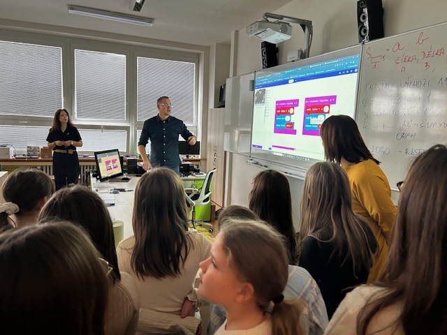 Celým dňom nás veľmi ochotne sprevádzali pani riaditeľka spolu s pani zástupkyňou a pani učiteľkou, ktorej vďačíme za spoluprácu pri tejto mobilite. Žiaci mali možnosť nahliadnuť do odborných učební, z ktorých najväčší záujem vzbudili učebne fyziky, prírodopisu, jazykové laboratórium a úplnou čerešničkou bola učebňa robotiky. Objavovanie, pozorovanie, skúmanie a tímové riešenie úloh prirodzene prepájali prvky STEM vzdelávania. Snáď najzaujímavejšou bola hodina fyziky s využitím technických pomôcok, kde pán učiteľ s ľahkosťou vysvetlil žiakom pohyb, rýchlosť a spôsob otáčania Zeme, prenos zvuku a tiež fungovanie motora. Cez optiku ďalekohľadu si pozreli najvzdialenejšie miesta v Bruntáli. Na hodine informatiky naši žiaci kooperovali pri programovaní micro:bitov. Odmenou za plnohodnotné dopoludnie bol skvelý obed a prehliadka centra mesta. Najväčším prekvapením bolo vonkajšie klzisko s vianočnou atmosférou, ktorá neodmysliteľne patrí k tomuto adventnému obdobiu. Tento fantastický deň sme zavŕšili kultovým filmom "S tebou mě baví svět", nakoľko niektoré scény z tohto filmu sa točili v Karlovej Studánke v Jeseníkoch, kde sa zajtra plánujeme vybrať na slovenskú expedíciu hneď po vyučovaní.