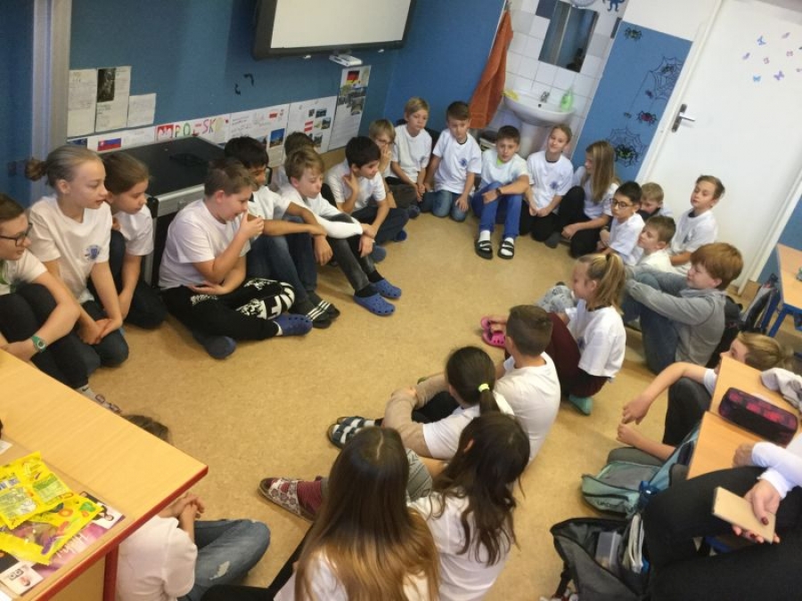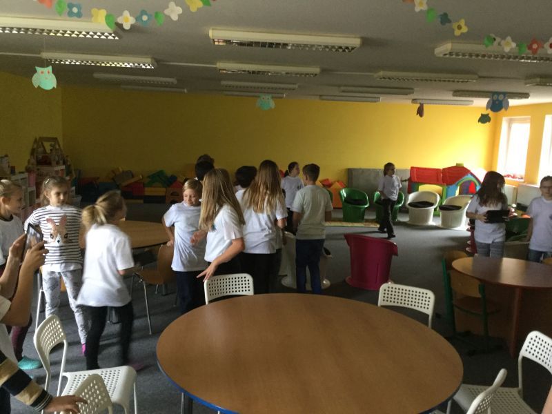 Nasledovala prehliadka priestorov ZŠ Komenského. V telocvični nás zaujala lezecká stena aj športová hala. Školu navštevuje 750 žiakov, ktorí majú možnosť pracovať v keramickej dielni, variť v školskej kuchynke, čítať v školskej knižnici aj hrať počas prestávok stolný tenis. Po prehliadke školy sme sledovali filmové spracovanie povesti o duchovi hôr – Rýbrcoulovi. Trutnov sa nazýva aj mesto draka, ktorý naňho dohliada. Duch hôr stráži Krkonoše, aby ich ľudia nedevastovali. Následne pracovali žiaci v skupinách, kde skladali puzzle týkajúce sa histórie mesta a vymaľovali Pozdrav z Krkonoš. Spolu so žiakmi 5.A pracovali aj na hodine informatiky.