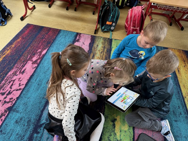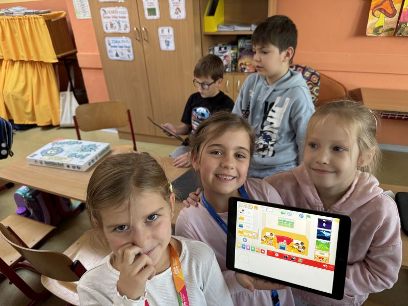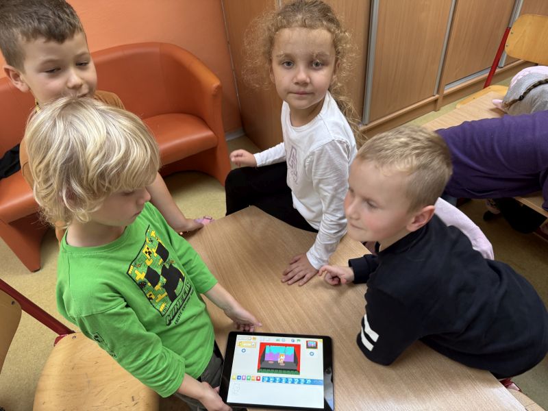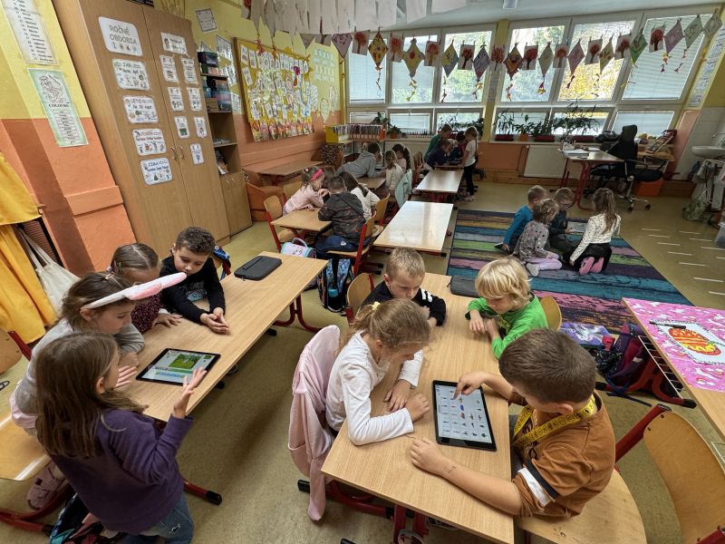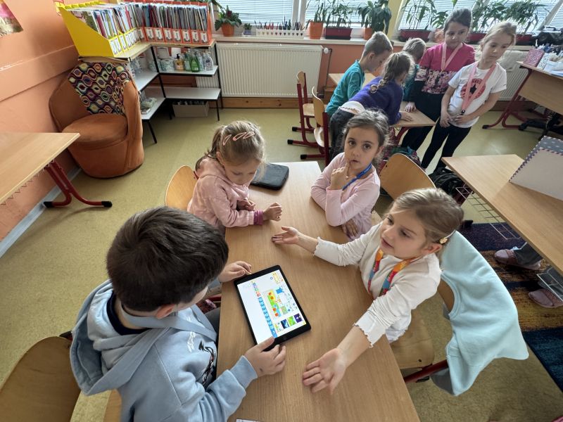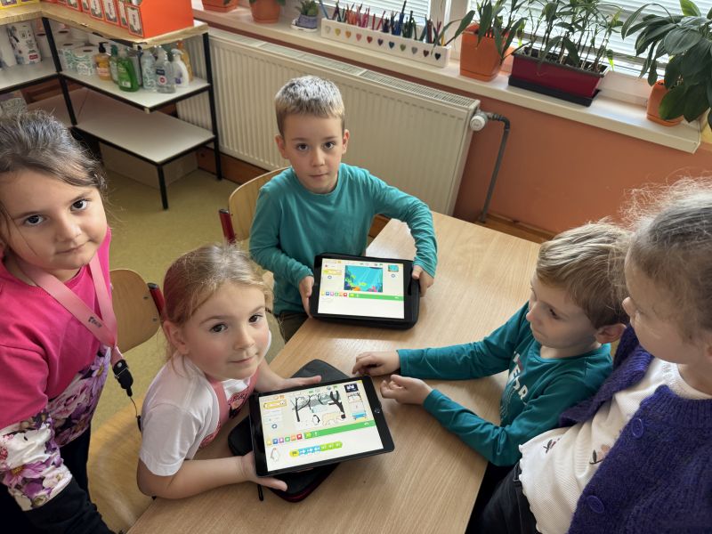Na prvom stupni kódovaním začali hneď prváci. Žiaci z sa ponorili do sveta vizuálneho programovania pomocou aplikácie . V tabletoch dávali dokopy farebné bloky príkazov a s úžasom sledovali, ako ich postavičky ožívajú a vytvárajú jednoduché animácie.