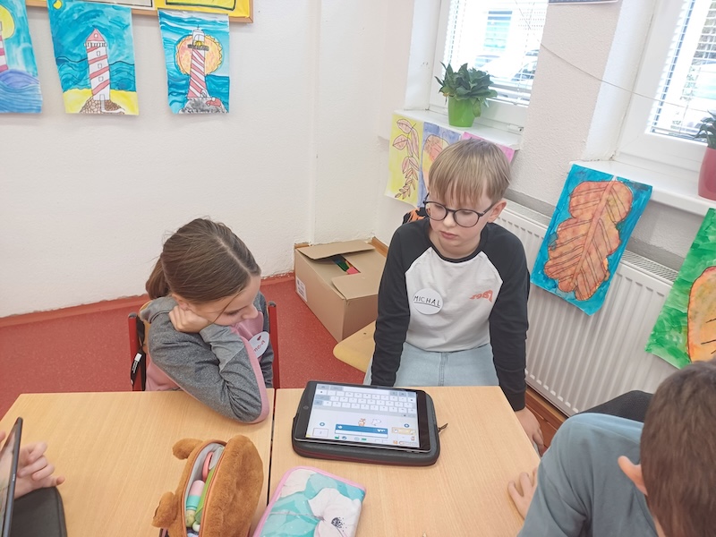 Štvrtáci pozvali na svoju hodinu kódovania aj žiakov z českej partnerskej školy, ktorí boli v tom čase u nás na mobilite. So žiakmi 4.A pekne spolupracovali a vytvorili animácie v aplikácii Scratch Jr.