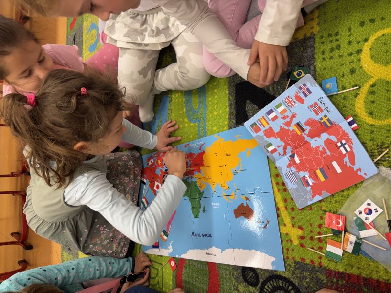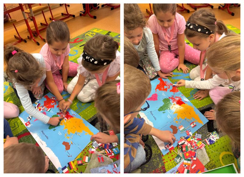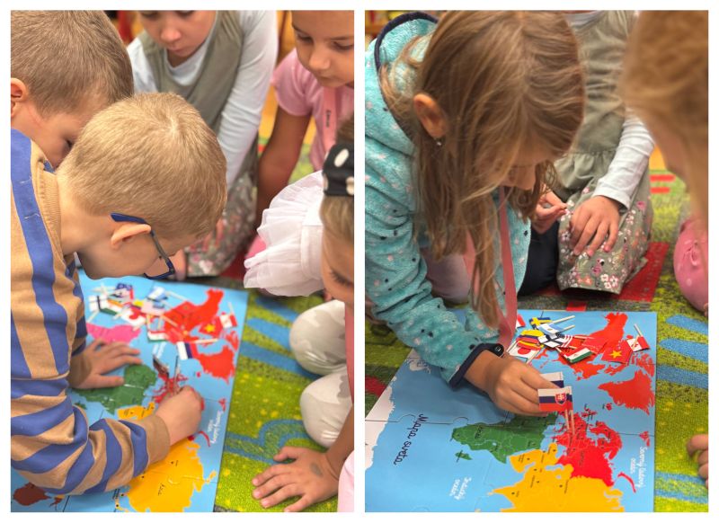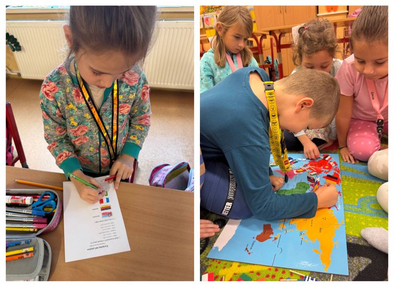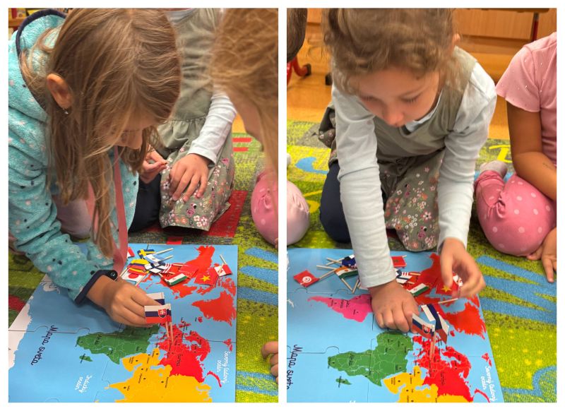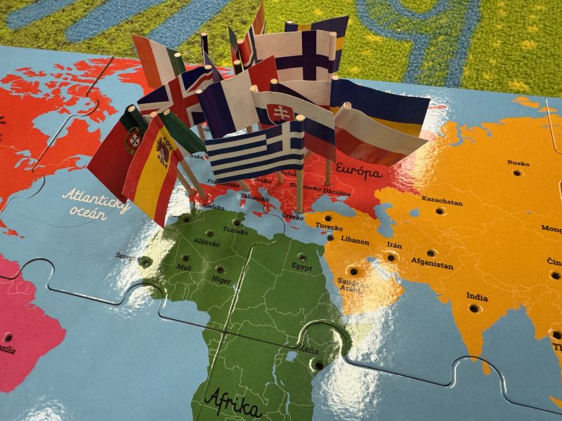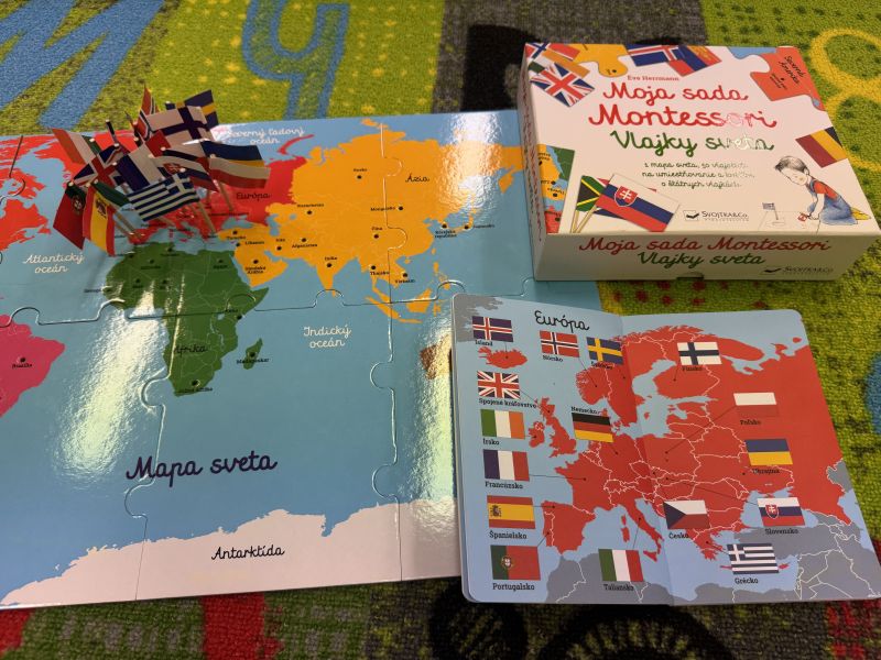 Nasledovala praktická a veľmi obľúbená aktivita. Trieda pracovala s Montessori skladačkou štátov a vlajok celého sveta. Po jej úspešnom zostavení sa prváci zamerali predovšetkým na Európu. S nadšením spoznávali vlajku každého európskeho štátu a aktívne ich zapichovali do príslušných krajín na mape. Táto aktivita im hravou formou pomohla spoznať nielen geografiu, ale aj symboliku jednotlivých národov.