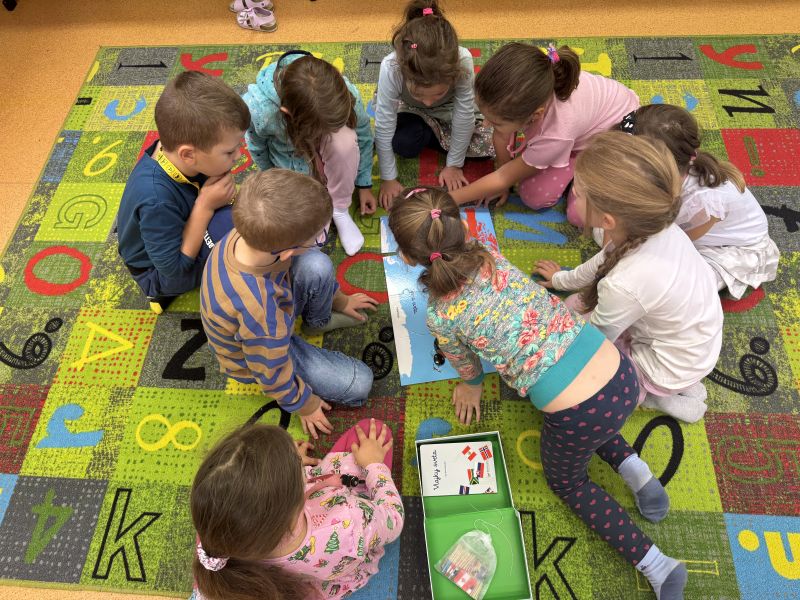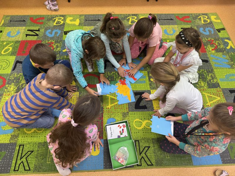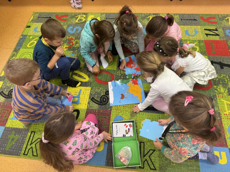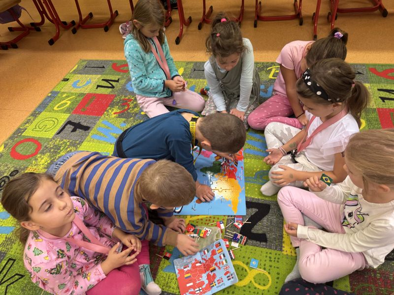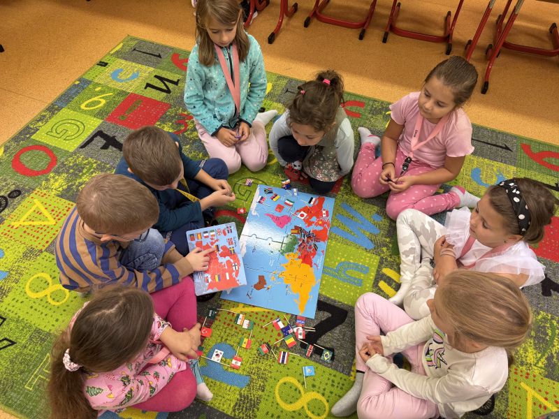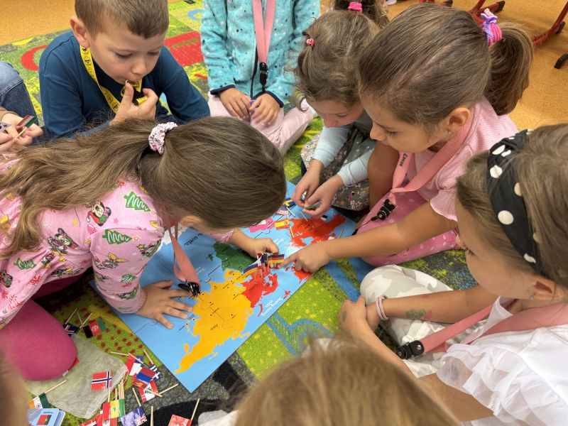 Nasledovala praktická a veľmi obľúbená aktivita. Trieda pracovala s Montessori skladačkou štátov a vlajok celého sveta. Po jej úspešnom zostavení sa prváci zamerali predovšetkým na Európu. S nadšením spoznávali vlajku každého európskeho štátu a aktívne ich zapichovali do príslušných krajín na mape. Táto aktivita im hravou formou pomohla spoznať nielen geografiu, ale aj symboliku jednotlivých národov.